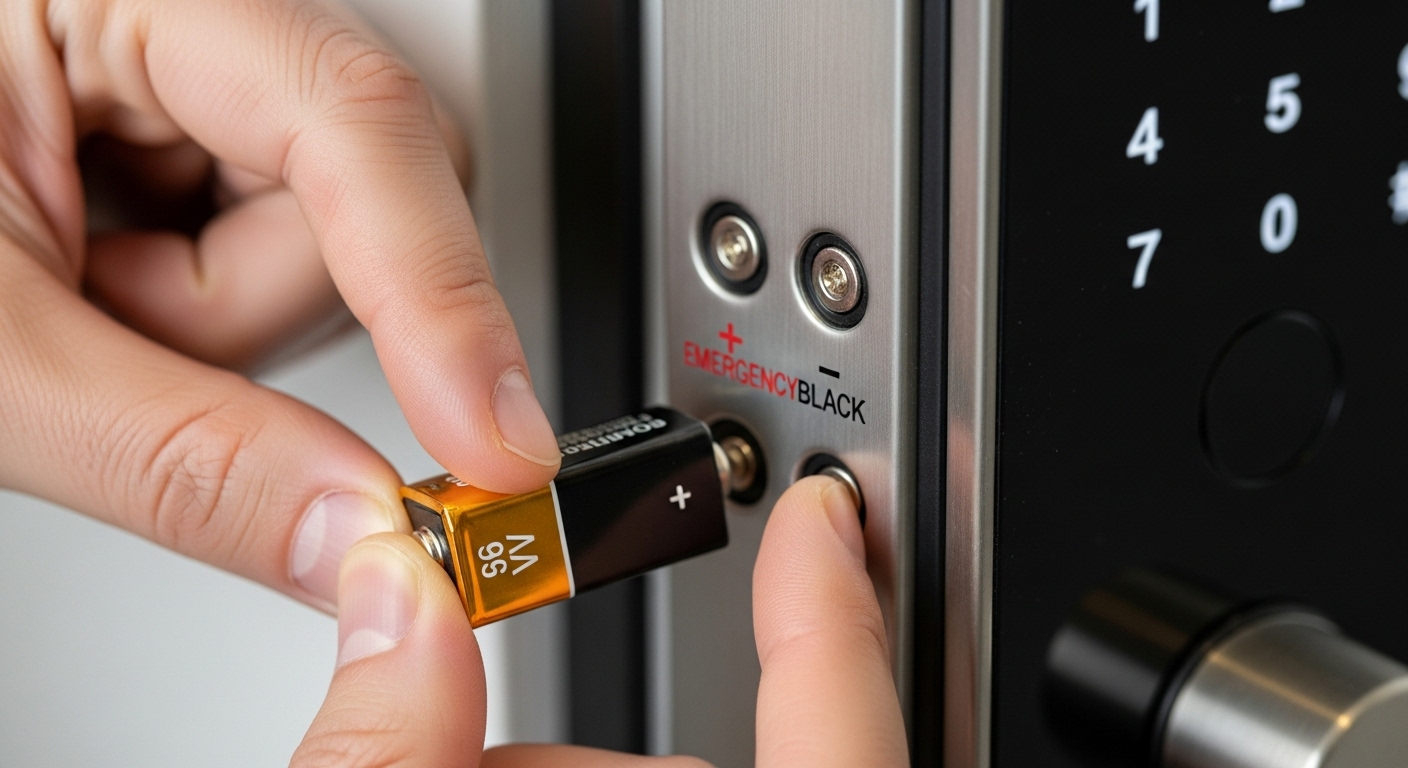 경고 신호를 놓치고 결국 배터리가 완전 방전되어 비밀번호가 작동하지 않을 때, 저처럼 당황하지 마세요! 대부분의 디지털 도어락에는 '비상 전원 단자'가 있습니다. 여기에 9V 건전지를 연결하여 일시적으로 전원을 공급하고 문을 열 수 있습니다.