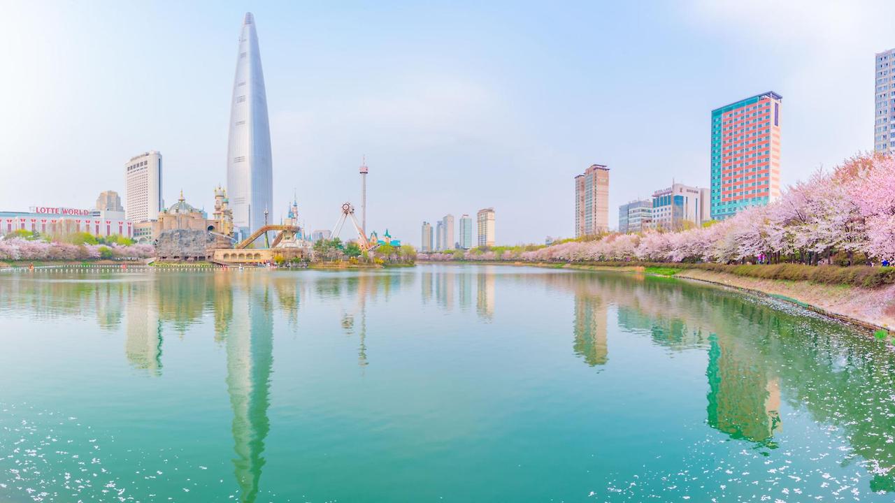 롯데월드 주변 호수를 따라 벚꽃이 피며 야경 벚꽃 명소로 유명합니다.